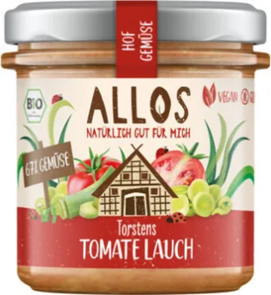 Nella crema spalmabile Pomodori e Porri di Torsten, la dolcezza dei pomodori si combina col sapore intenso e leggermente piccante dei porri. Il prodotto è privo di glutine e vegano e contiene ben il 67% di verdure.