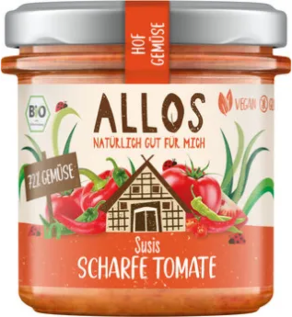 La crema spalmabile pomodoro piccante della linea Verdure dell'Orto Bio di ALLOS contiene ben il 72% di verdure e porta in tavola tutto il sapore intenso del pomodoro con una meravigliosa nota piccante. La piccantezza è dovuta al peperoncino in polvere che esalta il sapore del pomodoro e delle altre spezie senza coprirli.