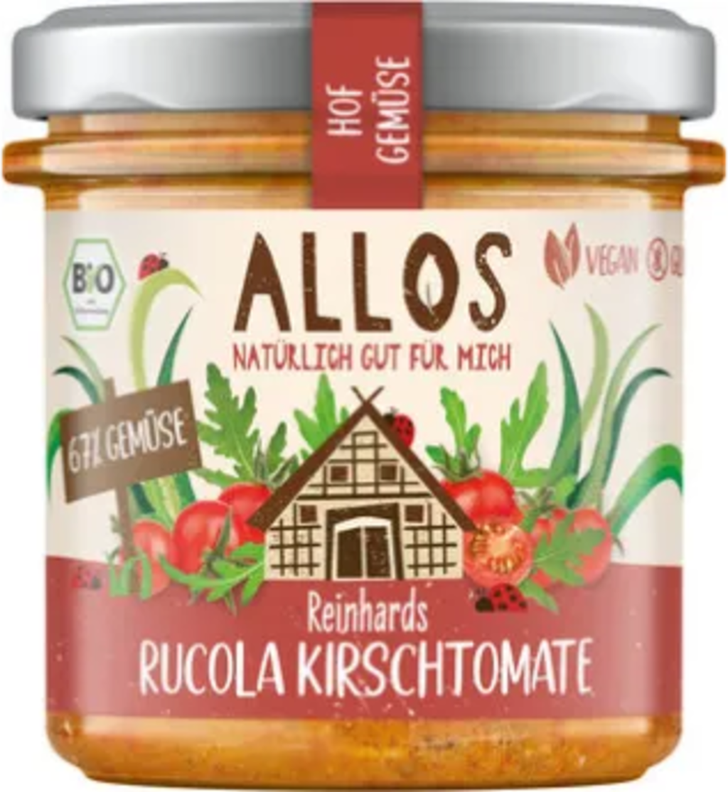 Rucola e Pomodorini di Reinhard è una crema spalmabile che combina perfettamente l'aroma dolce e fruttato dei pomodorini con quello fresco e aromatico della rucola. Con il 67% di verdure, la crema è vegana e senza glutine e ha un gusto spiccatamente mediterraneo..