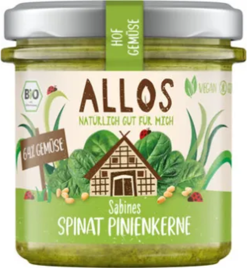 Una crema spalmabile originale e gustosissima. Spinaci e Pinoli di Sabine ti stupisce con la dolcezza naturale degli spinaci combinata con il sapore aromatico dei pinoli. L'aggiunta di cipolla e spezie conferisce alla crema spalmabile carattere e sapore. Il prodotto è inoltre vegano, senza glutine e contiene il 64% di verdure.