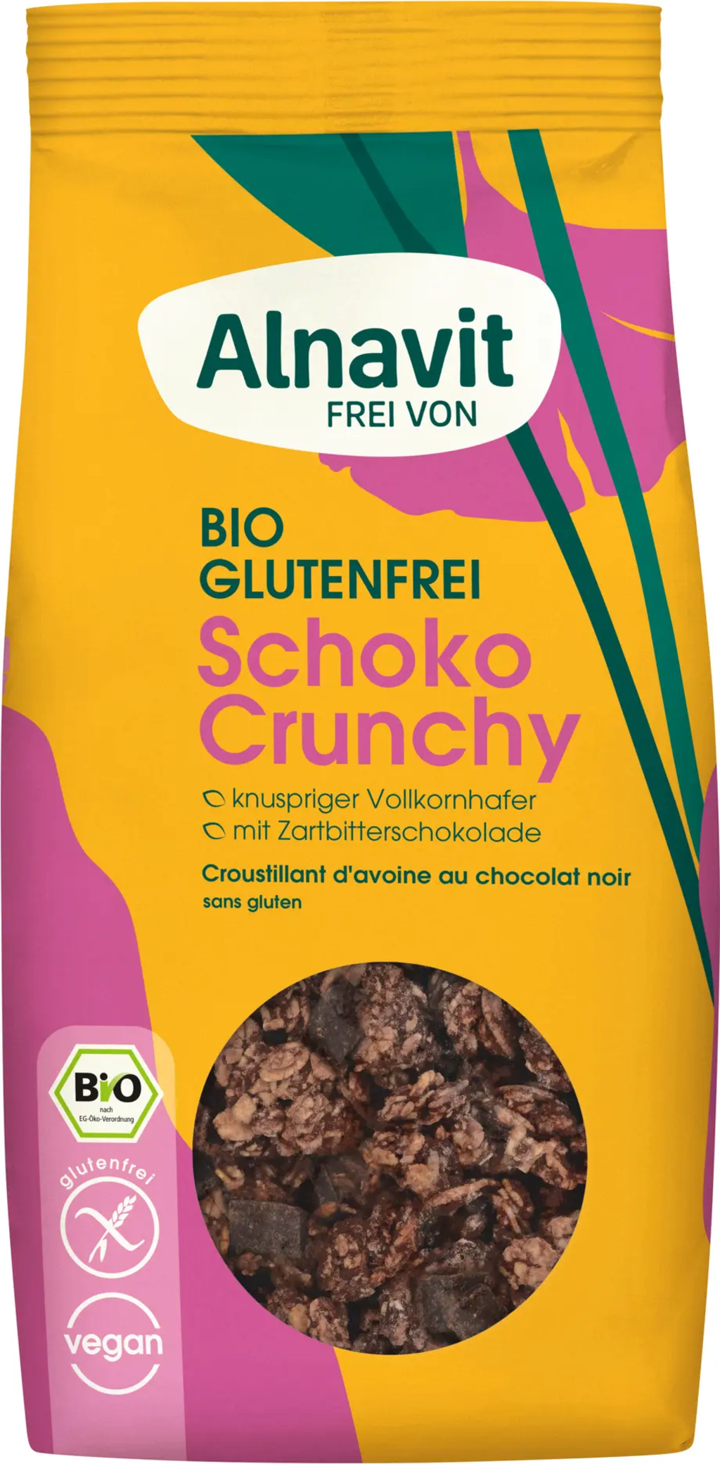 Il crunchy al cioccolato senza glutine unisce finissimo cioccolato fondente con avena integrale tostata, cocco grattugiato e cacao in polvere. Ideale come topping per yogurt, latte o bevande vegetali, oppure da sgranocchiare puro. Naturalmente bio, vegano e un punto di forza sulla tavola della colazione.