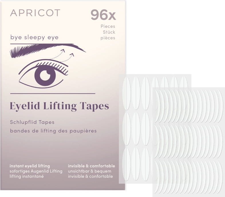 Con i tape per palpebre di APRICOT, puoi sollevare visivamente le palpebre cadenti e aggiungere luminosità allo sguardo. I nastri pretagliati sono trasparenti, discreti e facili da coprire con il trucco, permettendo loro di fondersi perfettamente con la pelle. Otterrai immediatamente uno sguardo più fresco. La confezione contiene lifting tape in due diverse misure.