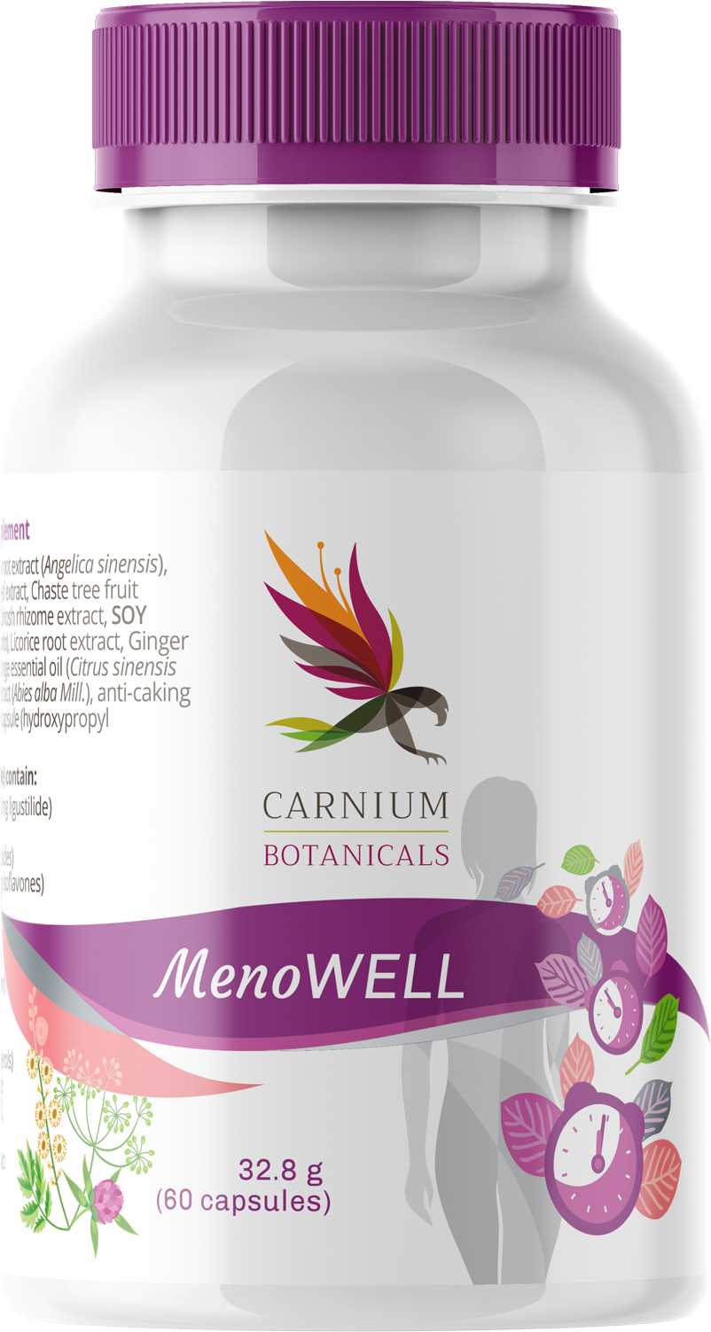 MenoWELL di Carnium Botanicals è formulato per supportare le donne nel periodo di cambiamenti ormonali. Contiene ingredienti di valore come agnocasto, radice di igname, foglie di lampone, trifoglio rosso e dong quai (angelica cinese). Le capsule sono completamente naturali, vegane e senza glutine.