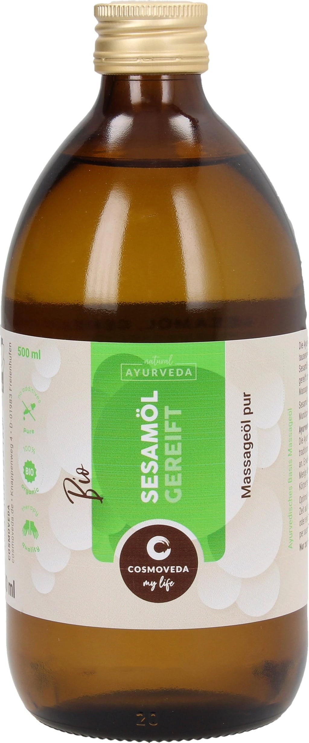 Olio di sesamo - conosciuto e utilizzato come olio da massaggio nell'Ayurveda da migliaia di anni. L'olio di sesamo di Cosmoveda è maturato con metodi tradizionali ed è quindi un prodotto da massaggio biologico di altissima qualità, adatto per massaggiare tutte le parti del corpo.