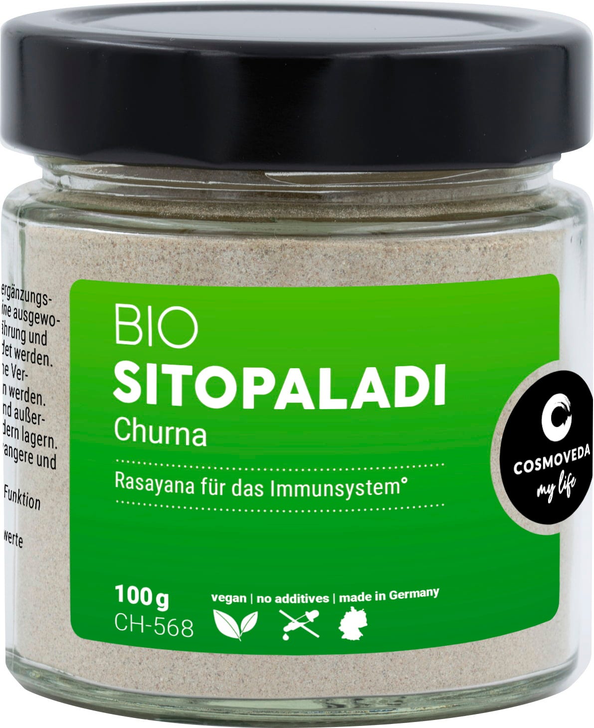 Bio Sitopaladi Churna di Cosmoveda contiene una miscela di erbe ayurvediche di pepe lungo, cardamomo, cannella, bambù e zucchero di canna grezzo, tutto in qualità biologica.