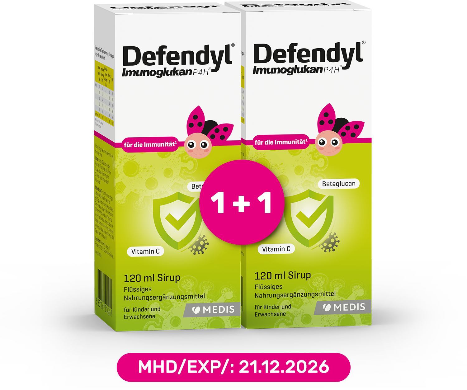 Lo sciroppo Defendyl-Imunoglukan P4H® in confezione doppia offre una soluzione di origine vegetale in forma liquida, adatta già ai bambini a partire dall'età prescolare. La vitamina C contenuta contribuisce alla normale funzione del sistema immunitario e supporta la riduzione della stanchezza e dell'affaticamento. La base è costituita dall'Imunoglukan brevettato, ottenuto dal fungo Pleurotus ostreatus. Poiché lo sciroppo è insapore e privo di glutine e lattosio, può essere facilmente integrato nella routine quotidiana. Con il bundle 1+1 gratis si ottiene una scorta pratica per un utilizzo a lungo termine.