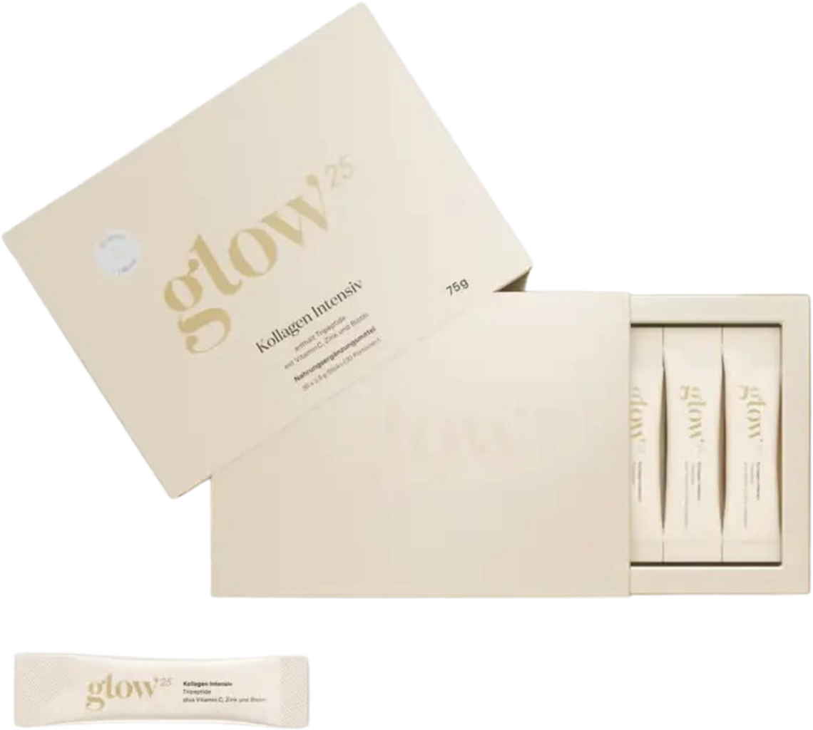 La formulazione di Glow25 Collagen Intensive in polvere vanta un'innovativa formula tripeptidica in cui i piccoli tripeptidi di collagene (circa 500 Dalton) vengono scomposti in modo ottimale grazie alla scissione enzimatica. Ciò consente al corpo di assorbire il collagene in modo particolarmente rapido. La polvere è insapore e arricchita con vitamina C, zinco e biotina (nota anche come vitamina H).