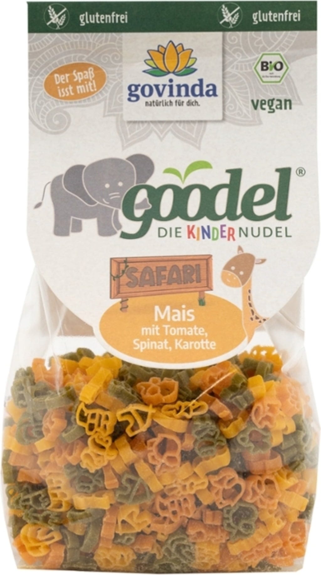 La pasta Kinder Goodel “Safari” di Govinda offre un colorato divertimento nel piatto con forme di animali selvatici africani. Prodotta in manifattura italiana, l'impasto delicato di mais è naturalmente arricchito con pomodoro, carota e spinaci. Essiccata con cura, questa pasta è senza glutine e tiene bene la cottura. Una scelta vivace e consapevole per il piatto dei bambini, senza additivi artificiali.