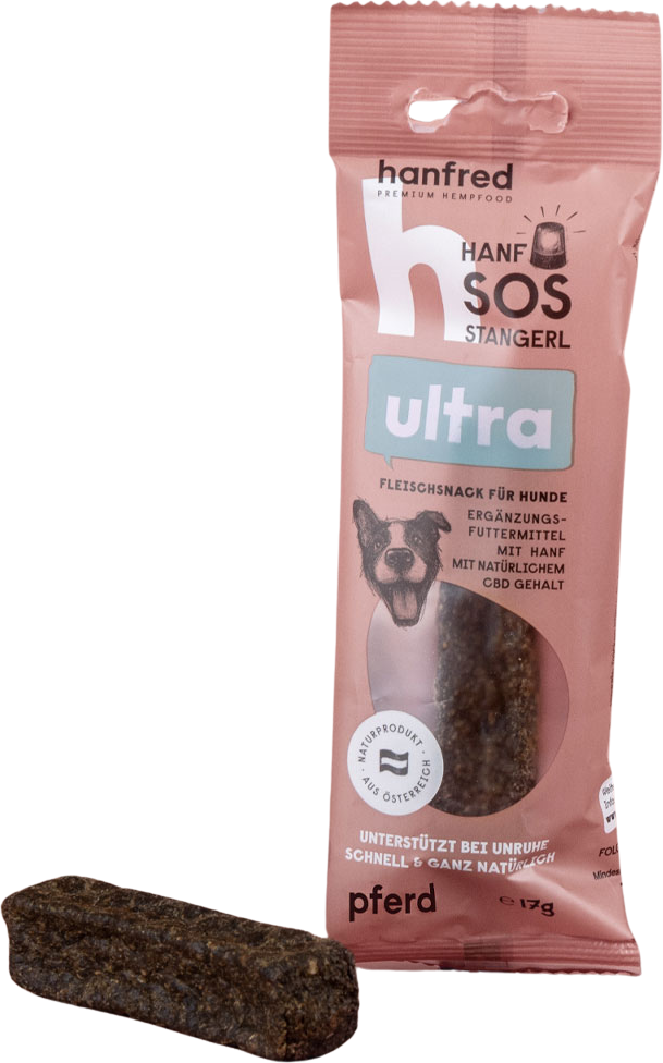 I bastoncini SOS Ultra contengono il 25% di canapa e sono pensati come alimento complementare per il cane, particolarmente indicati in viaggio o in situazioni insolite. Realizzati con carne succosa e polvere di canapa, senza aggiunte superflue.