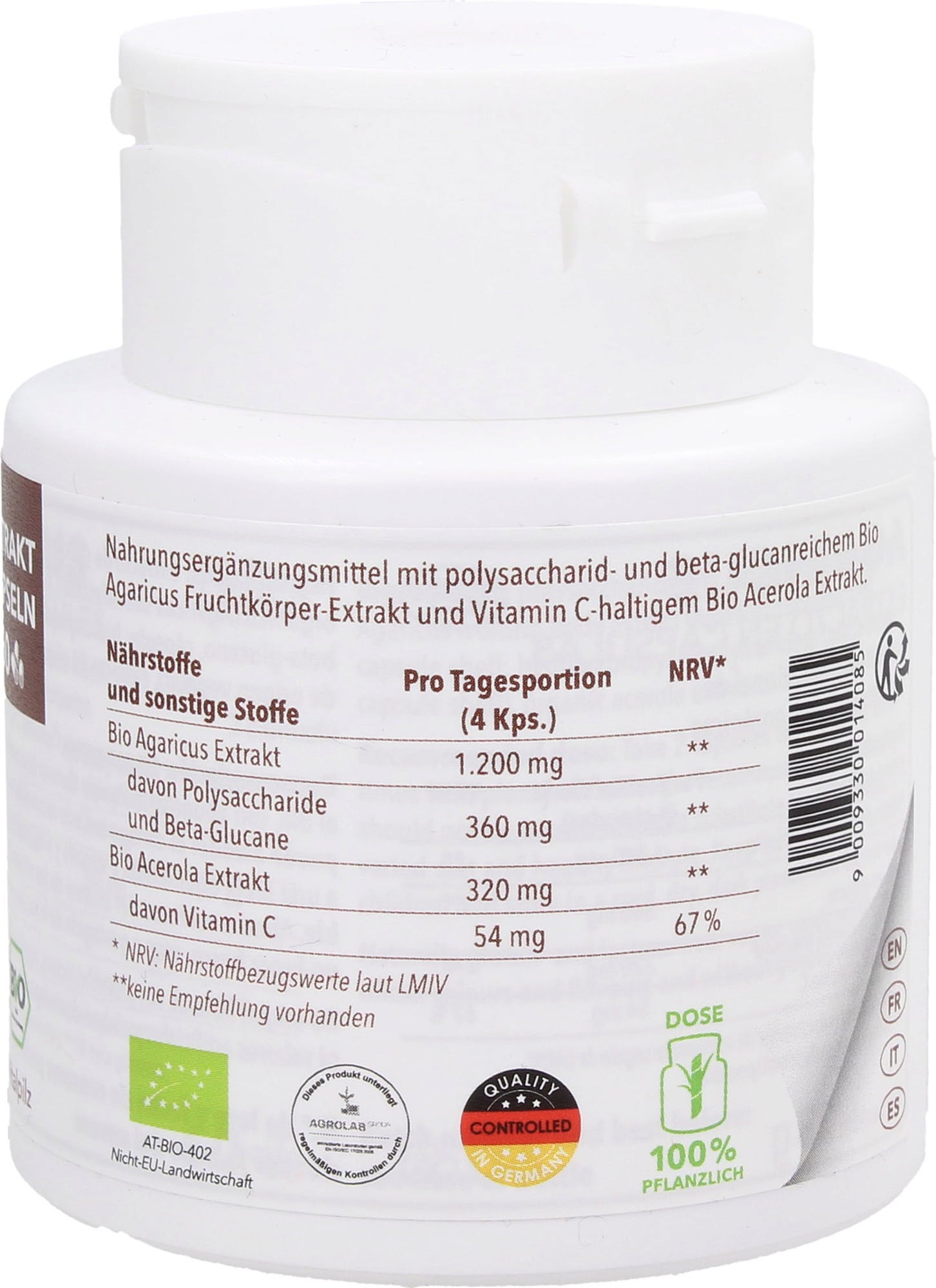 L'Agaricus subrufescens utilizzato contiene naturalmente preziosi polisaccaridi. Le capsule offrono vitamina C ed estratto di Agaricus biologico 20 volte concentrato. Il fungo è stato lavorato utilizzando un processo tradizionale ad acqua calda, affinché i preziosi polisaccaridi rimangano intatti.