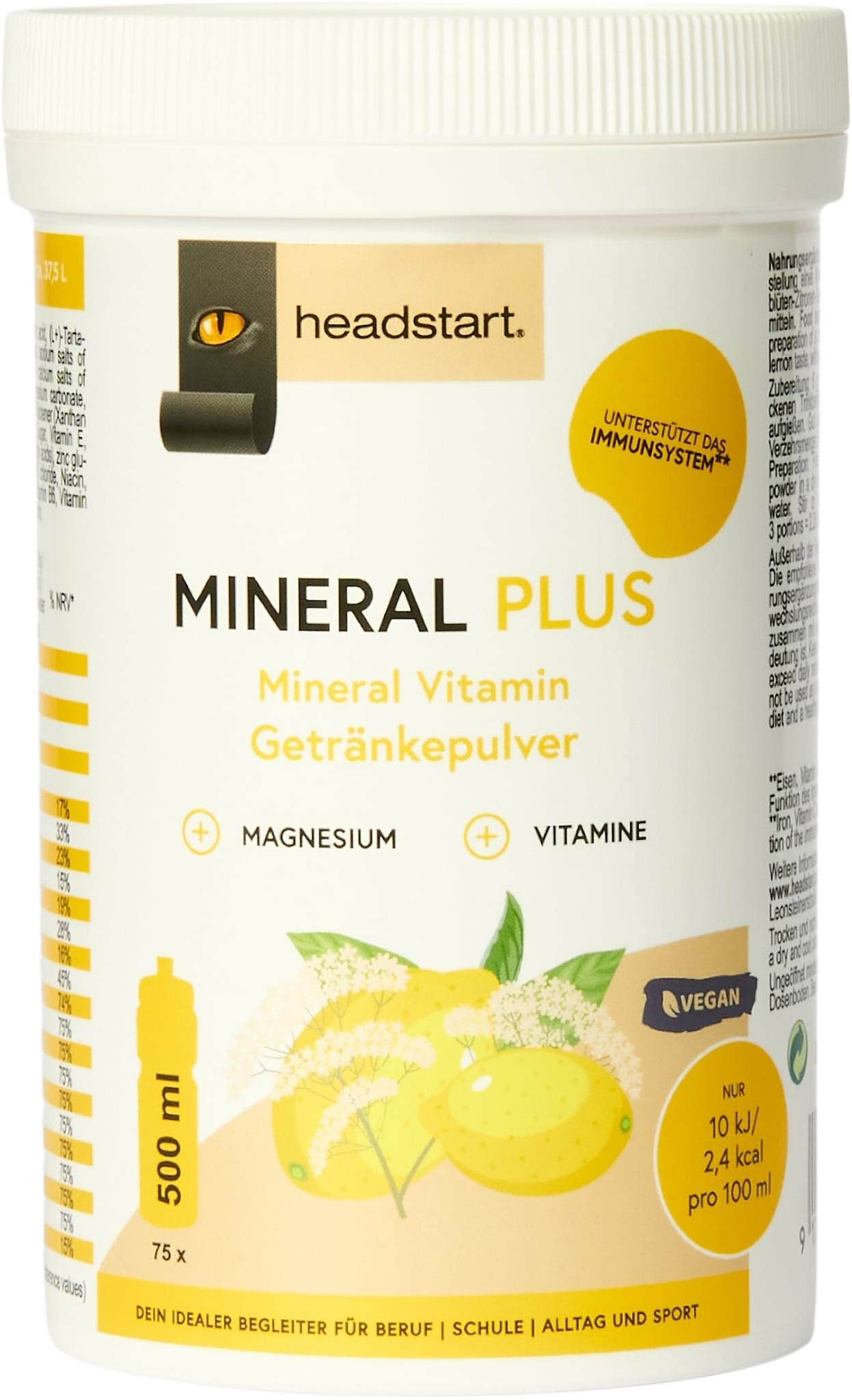 Mineral Plus Polvere di Headstart è una bevanda in polvere ricca di minerali e vitamine che trasforma istantaneamente l'acqua in una bevanda rinfrescante al gusto di limone, completamente priva di coloranti artificiali, conservanti o caffeina. La formula ipocalorica si dissolve facilmente in acqua naturale o frizzante, per un piacere senza complicazioni.