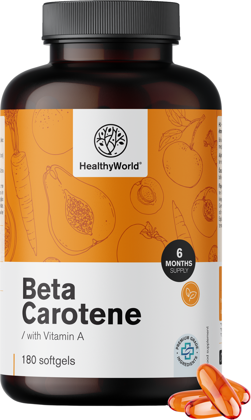 Capsule molli che combinano beta-carotene e vitamina A. Il beta-carotene è un colorante naturale e può essere convertito dall'organismo in vitamina A. La vitamina A contribuisce al mantenimento della capacità visiva normale. Le capsule molli vegan sono facili da assumere e sono senza glutine e lattosio.