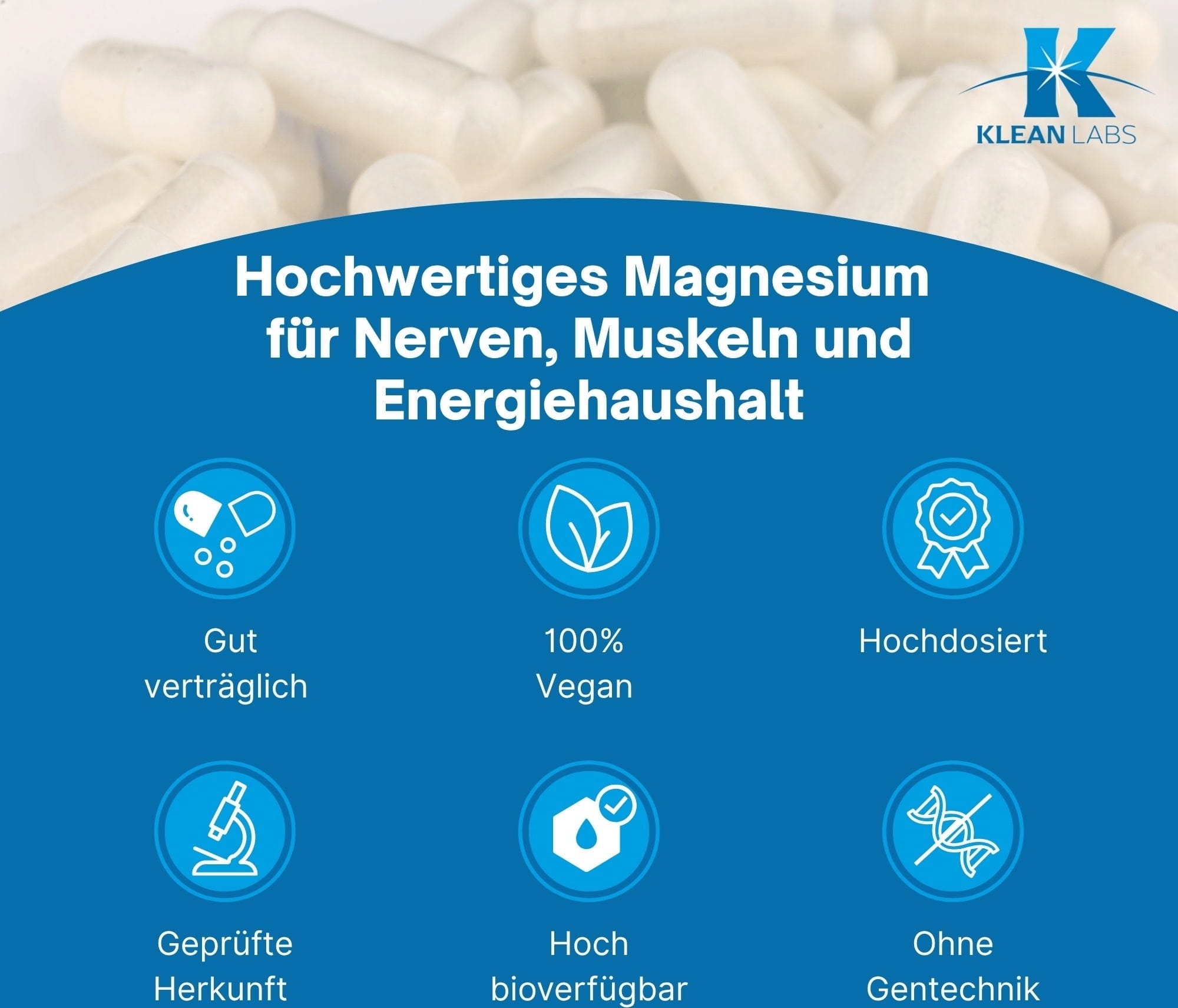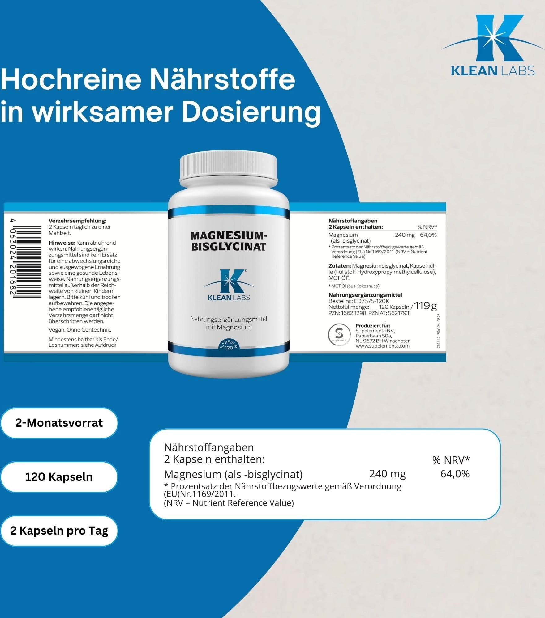 Le capsule di bisglicinato di magnesio vegane e prive di OGM di KLEAN LABS contengono 240 mg di magnesio per dose giornaliera. È possibile assumere 2 capsule al giorno.