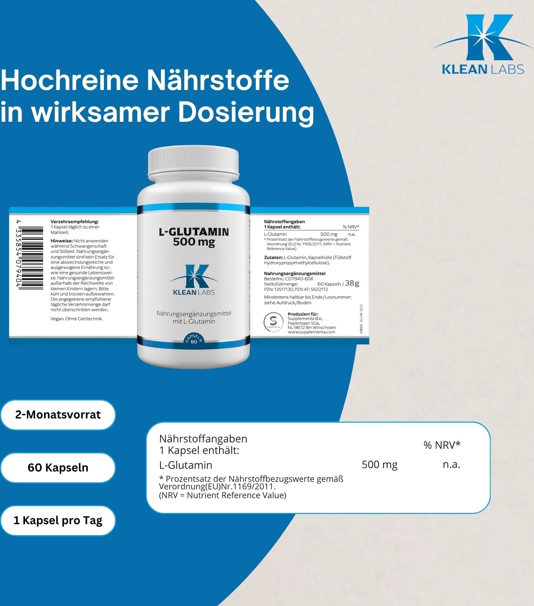 KLEAN LABS L-Glutammina 500 mg, 60 capsule