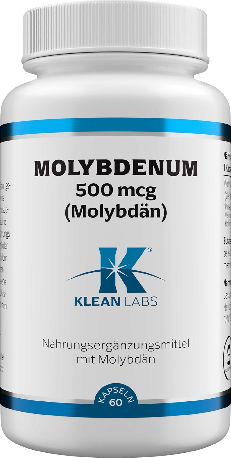 Questo prodotto di Klean Labs contiene 500 µg di molibdeno per capsula. L'integratore alimentare è inoltre 100% vegan e privo di OGM.