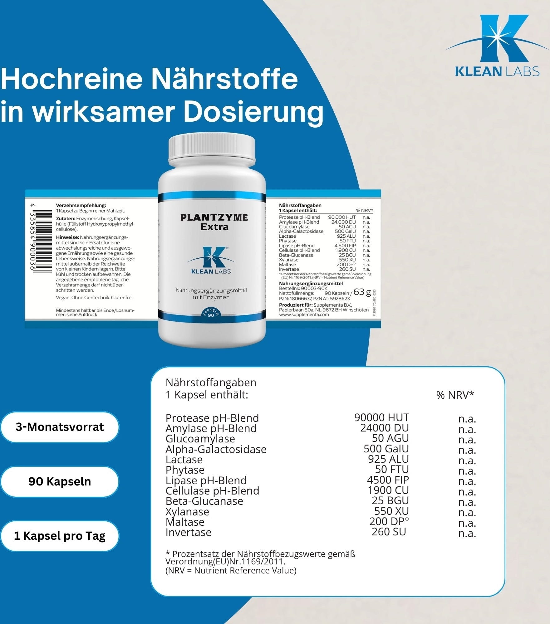 PlantZyme Extra di KLEAN LABS contiene un dosaggio particolarmente elevato di enzimi vegetali, oltre a cellulasi. Questa speciale formulazione copre un ampio spettro di nutrienti ed è stabile al pH. Il preparato è adatto anche a una dieta ricca di fibre e a base vegetale.