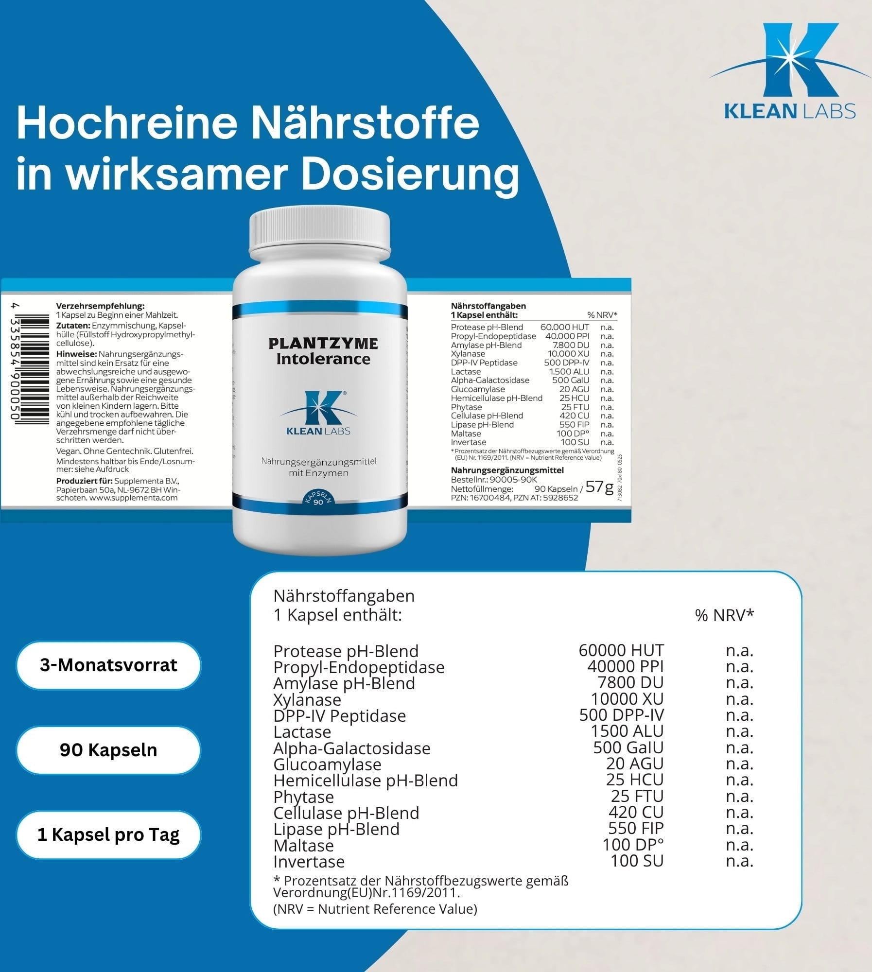 PlantZyme Intolerance è una miscela di enzimi vegetali appositamente sviluppata per scomporre vari componenti alimentari come lattosio, caseina, glutine e fenoli. Contiene amilasi, proteasi e lipasi, che scompongono enzimaticamente carboidrati, proteine e grassi.