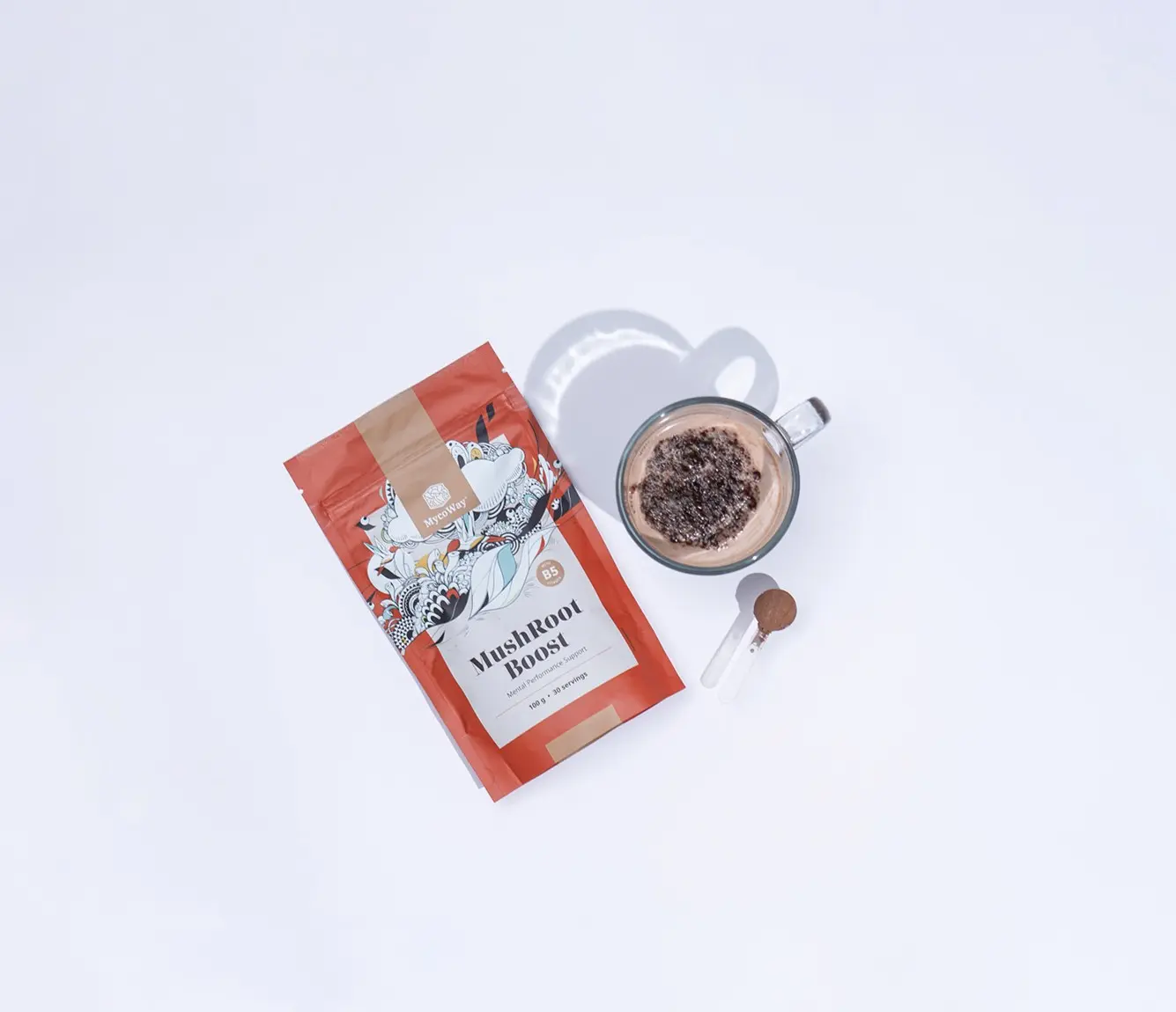 cacao in polvere, estratto di maca, estratto di erba mate (maltodestrina), micello di Cordyceps, estratto di radice di rodiola rosa (1 % salidroside), Hericium erinaceus, estratto di Reishi (Ganoderma lucidum), Panax ginseng, galanga (Rasna, Alpinia galanga), Calcium-D-Pantothenat