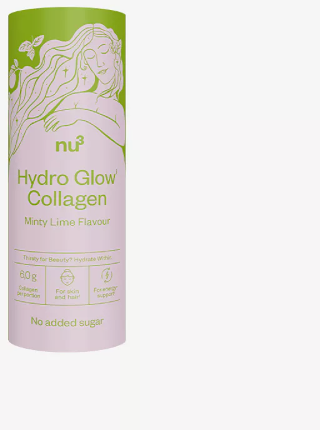 Il drink Hydro Glow Collagen di nu3 combina 6 g di collagene idrolizzato con un complesso funzionale di vitamina B. Niacina, acido pantotenico, vitamina B6 e vitamina B12 contribuiscono al normale metabolismo energetico. La bevanda è pronta da bere, fruttata e senza zuccheri aggiunti.