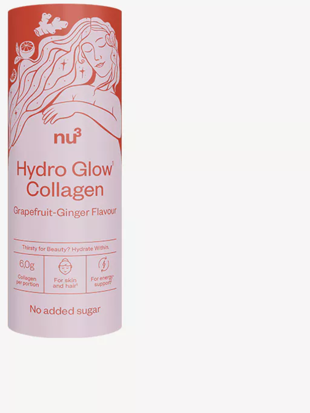Il drink Hydro Glow Collagen di nu3 combina 6 g di collagene idrolizzato con un complesso funzionale di vitamina B. Niacina, acido pantotenico, vitamina B6 e vitamina B12 contribuiscono al normale metabolismo energetico. La bevanda è pronta da bere, fruttata e senza zuccheri aggiunti.