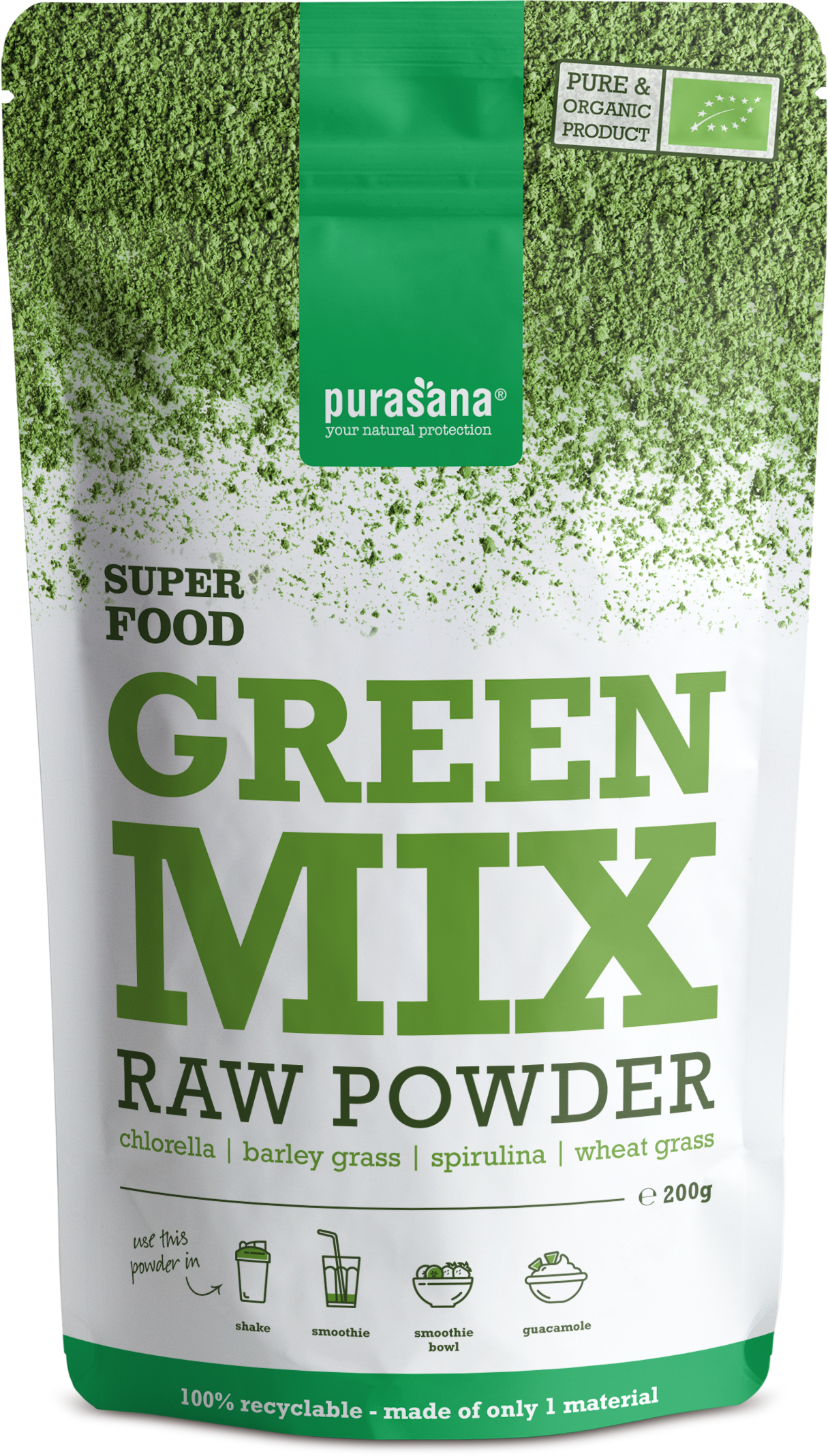 Il Green Mix Bio di Purasana è una miscela verde di alimenti crudi a base di clorella, spirulina, erba di grano ed erba d'orzo. È una fonte naturale di fitonutrienti che vengono facilmente assorbiti dal corpo.