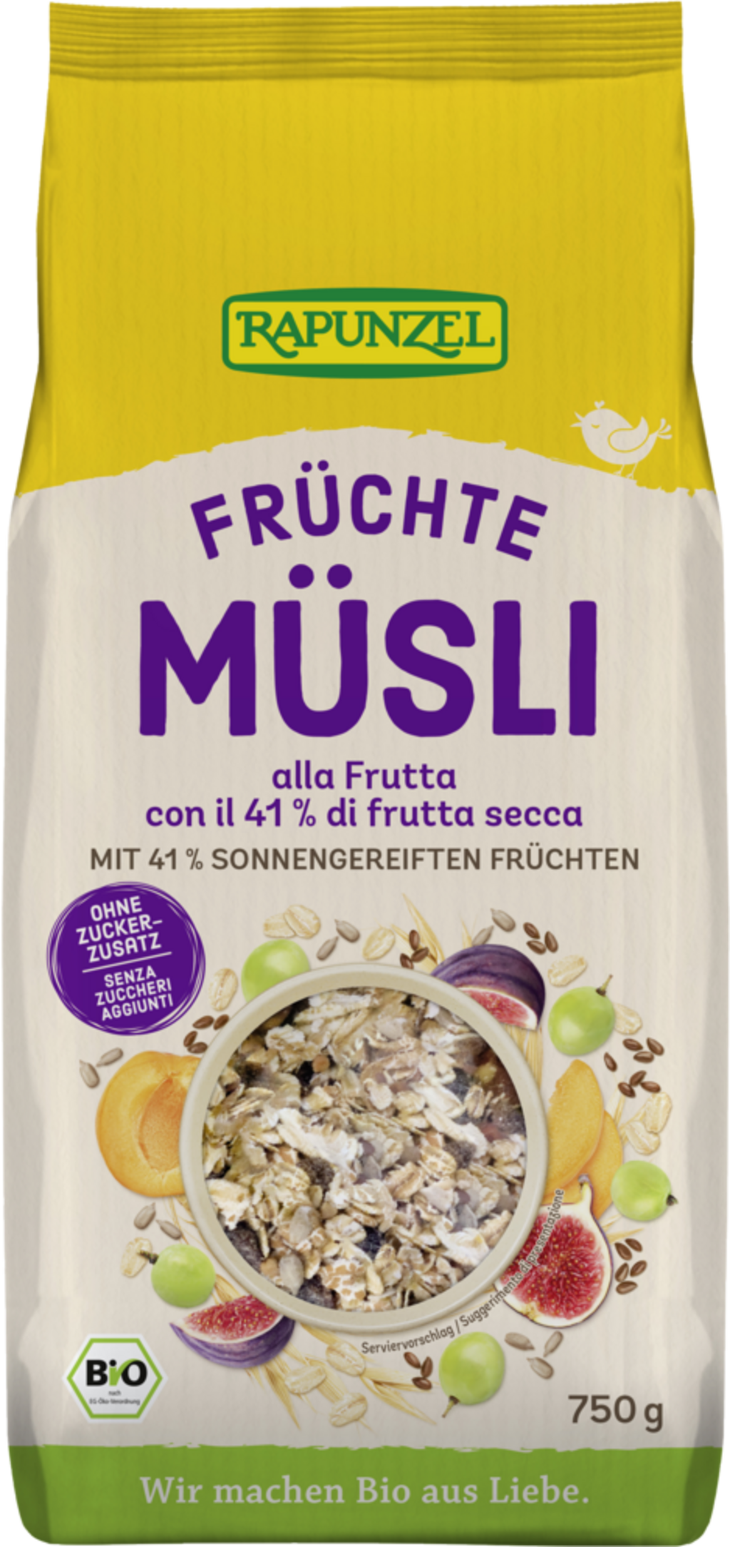Il muesli alla frutta di Rapunzel ha un contenuto di frutta minimo del 40% e assicura un inizio di giornata particolarmente dolce e fruttato. Il mix non contiene zuccheri aggiunti, perché la dolcezza deriva esclusivamente dagli ingredienti che contiene, come albicocche essiccate, fichi secchi e uva sultanina. Una vera delizia per la colazione!