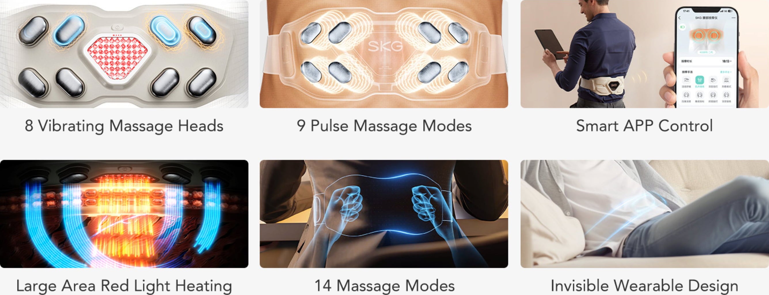 SKG W9 Pro offre una combinazione avanzata di vibrazione meccanica e massaggio a impulsi elettrici, sviluppata specificamente per la zona lombare. Con nove livelli di intensità della tecnologia a impulsi e tre programmi di vibrazione, l'applicazione può essere regolata con precisione in base alle esigenze individuali. Grazie all'app integrata “Future Wear”, il dispositivo può essere comodamente controllato tramite smartphone per impostare modalità e intensità in formato digitale.