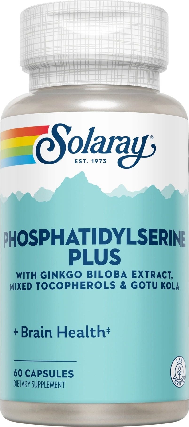 Fosfatidilserina Plus di Solaray contiene fosfatidilserina, ginkgo biloba, tocoferoli misti e centella asiatica.