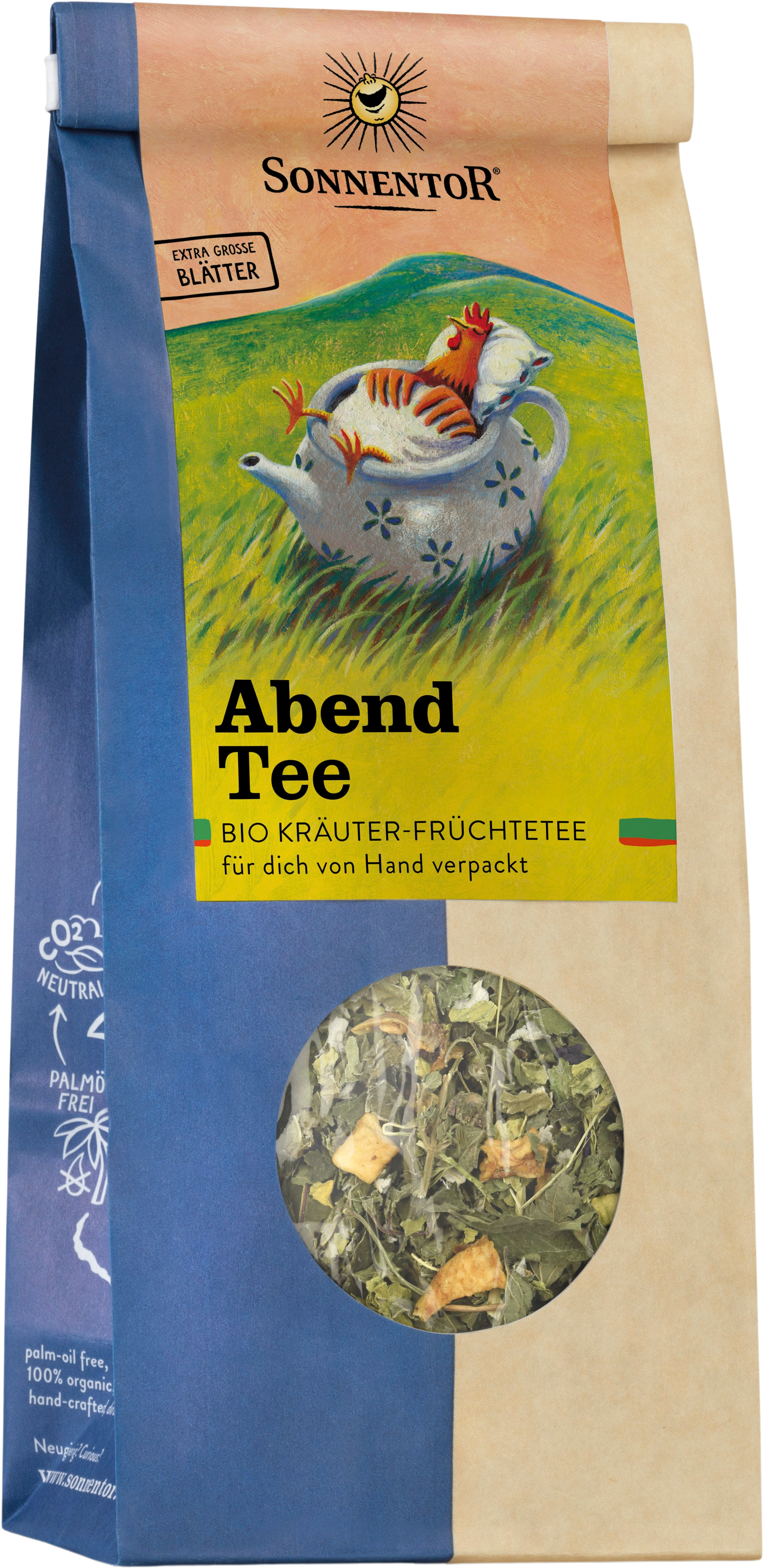 Per allontanarsi dal caos e dalla frenesia della vita di tutti i giorni, è utile per trascorrere la serata tranquillamente davanti ad una tazza di tisana. Questa miscela per la sera contiene erbe armoniosamente selezionate, dall'effetto rilassante. Oltre alla melissa, il mix contiene anche foglie di mora, malva selvatica e rosa canina.